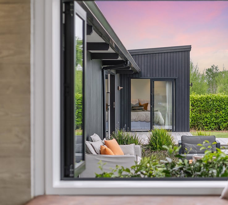 The open-plan kitchen, dining, and living areas are bathed in natural light, with an oversized cantilevered bay window that frames stunning views of the established Totara, Kowhai, Rimu, and Tulip trees beyond.